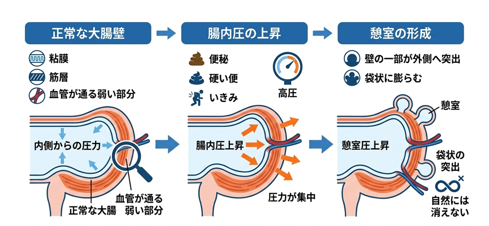 硬い便を押し出そうとする動きが続けば局所的に圧力が集中し、壁の弱い部分が外側へ膨らむのは避けられません。