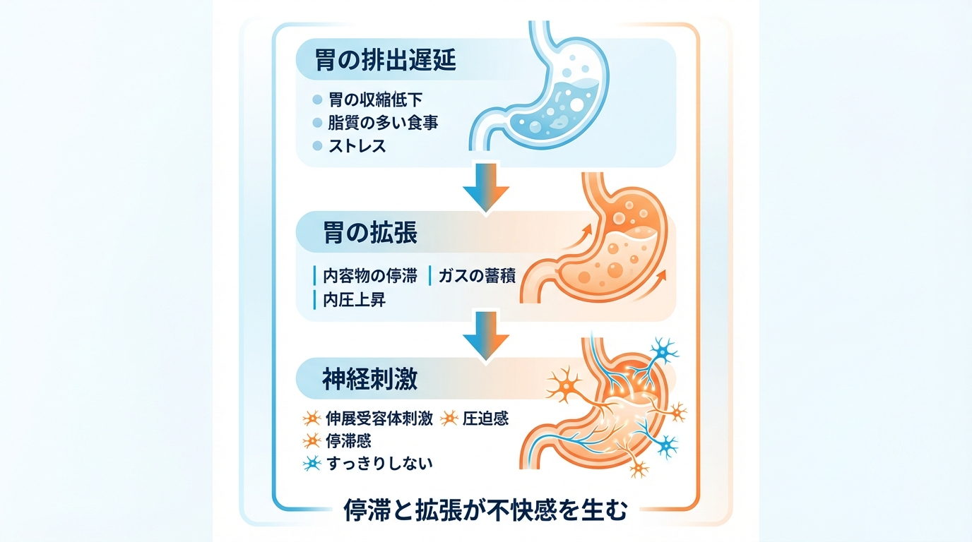 胃壁が強く伸ばされる状態が続くと圧迫刺激が持続するため、食後に重さや停滞感を感じやすくなります。