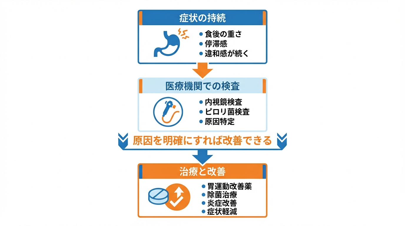 胃の収縮運動が低下し、食べた物を十二指腸へ送り出す働きが弱体化、消化途中の内容物が胃の中に長時間とどまるため、食後の重さや停滞感などの違和感が残ります。