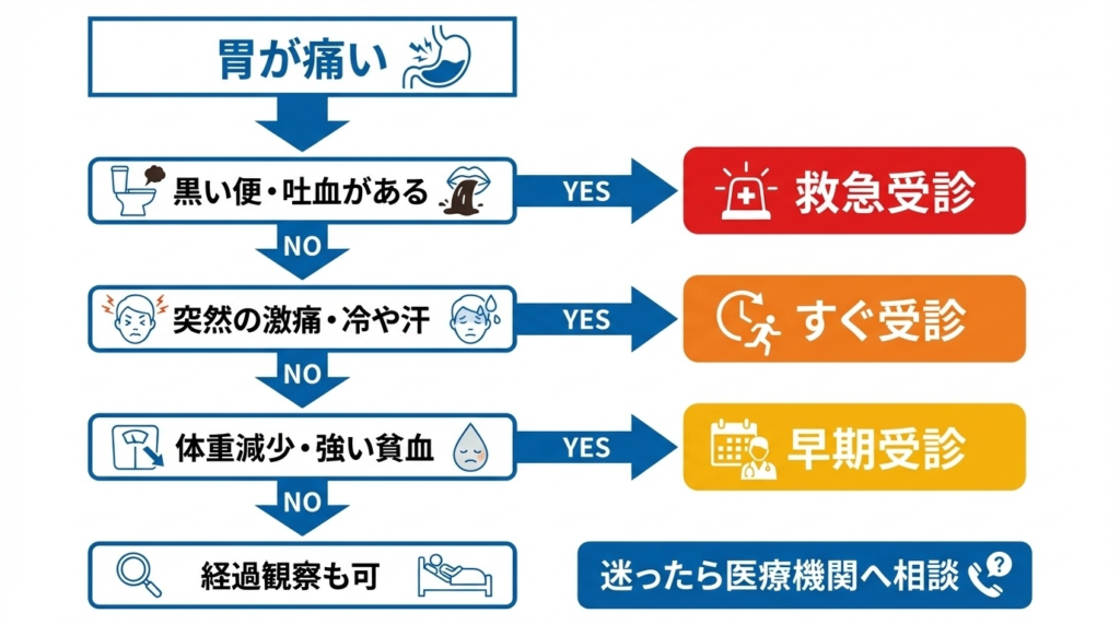 胃が痛い症状を感じて、黒い便や吐血、激痛・冷や汗、体重減少・貧血があるなら、今すぐ病院を受診すべきです。