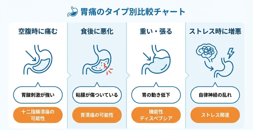 空腹時や食後、ストレス時など胃が痛いタイミング、重い・張るなど胃の痛み方で、原因や緊急性を測れます。