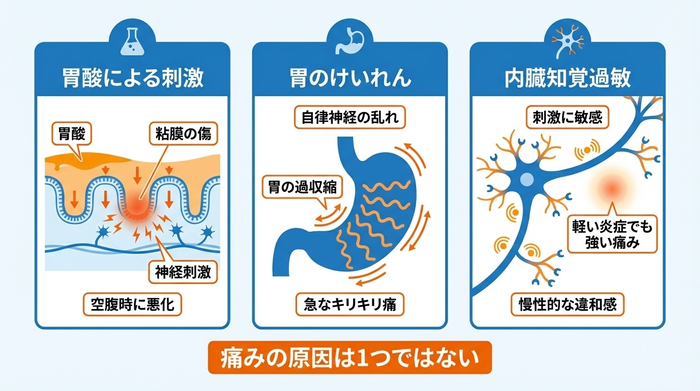 胃酸刺激や痙攣が痛みの背景にあり、月経周期やストレスとの関連の確認も欠かせません。