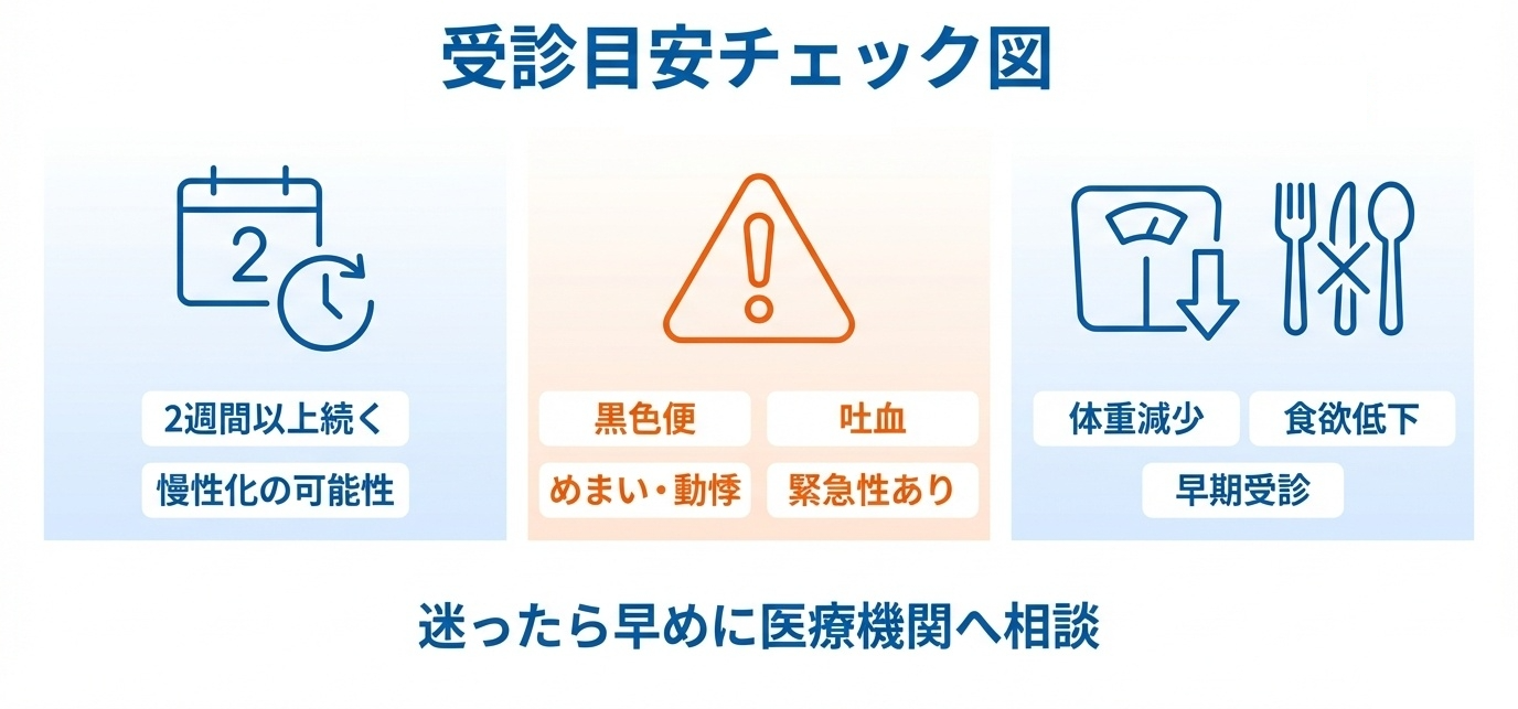 食欲低下が続いているなら要注意で、胃がキリキリ痛い程度に関わらず早期受診が必要です。