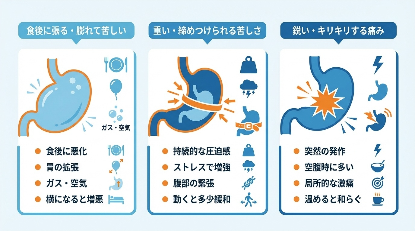 停滞すると胃の内圧が持続的に高まっていき、痛みよりも鈍い圧迫感として感じるのが特徴です。