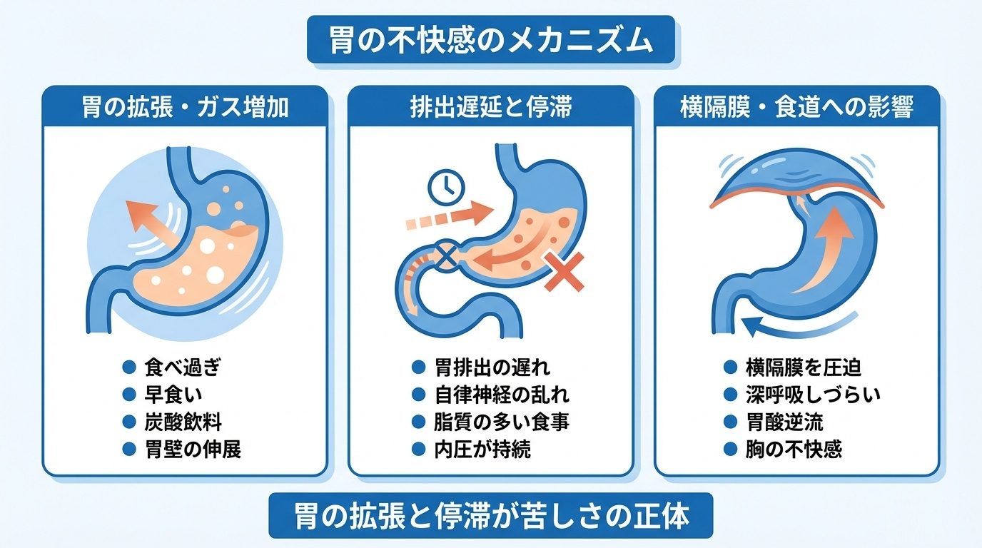 重石を乗せられたような胃が苦しい不快感は、内圧上昇や筋緊張が関与します。