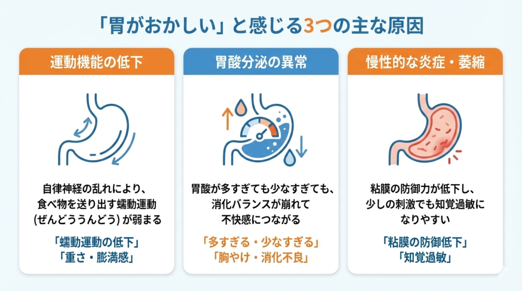 胃がおかしい感覚の背景には運動機能の低下や炎症があり、自律神経や胃酸分泌のバランスも関係しています。