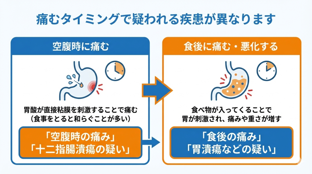 食後に軽くなる痛みは十二指腸潰瘍の特徴で、食後悪化するなら胃潰瘍を疑います。