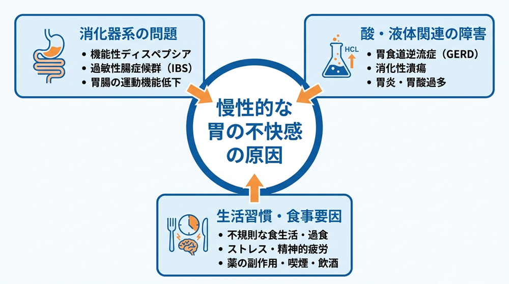 胃のムカムカが治らない状態は、胃の消化機能の低下や胃酸刺激など複数の要因が重なって起こります。