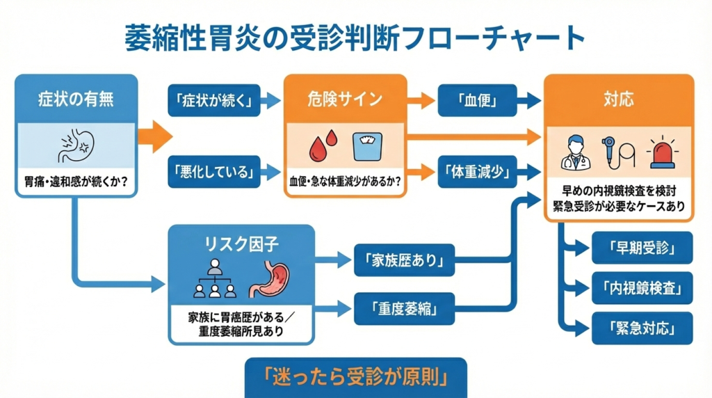 萎縮性胃炎も癌になる確率も、早期発見・早期治療が何より優先されるため、専門医と相談してフォロー計画を立てましょう。