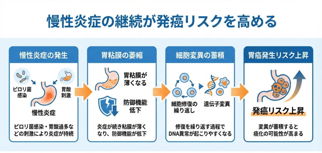 萎縮性胃炎は慢性炎症による胃粘膜萎縮が背景にあり、炎症→細胞変異→発癌のメカニズムが癌になる確率を高める要因になります。