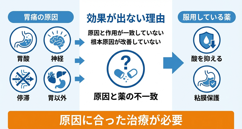 胃痛に薬が効かないのは、原因と薬の作用が一致していないからです。