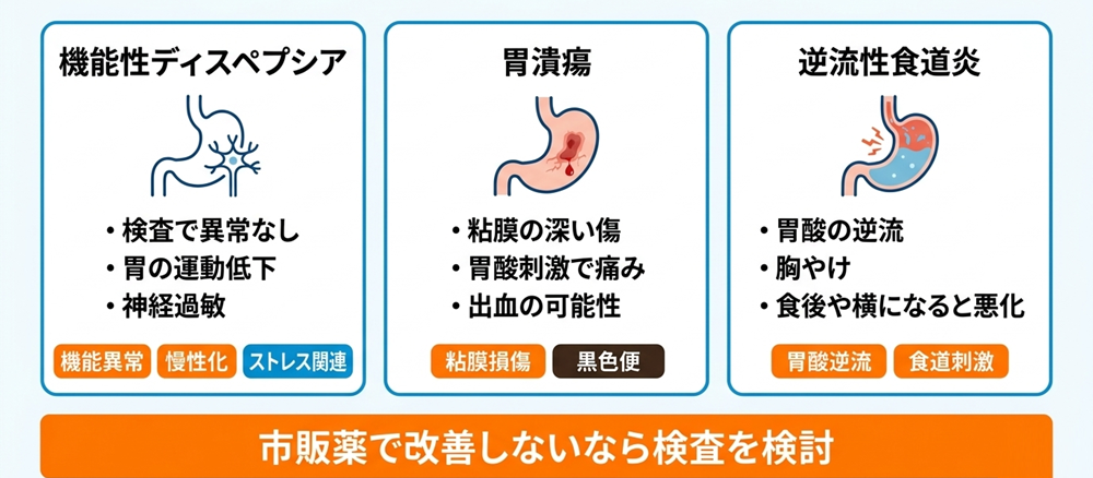 市販薬では酸を抑える力が不十分なため痛みが続きやすく、出血を伴うなら貧血や黒色便として現れます。