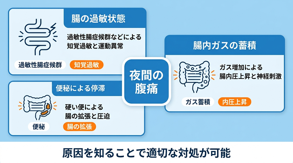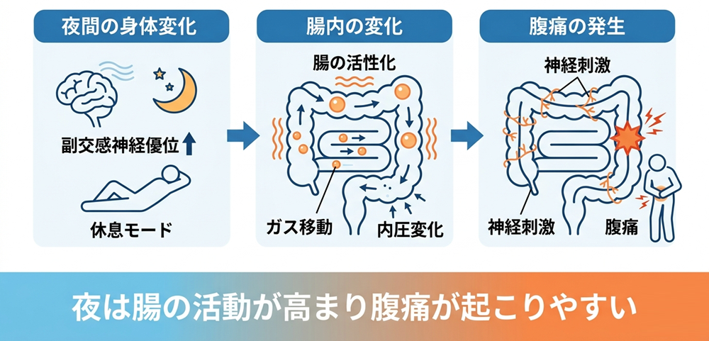 消化の遅れと腸の活動が重なるため、夜になると腹痛が発生しやすくなります。