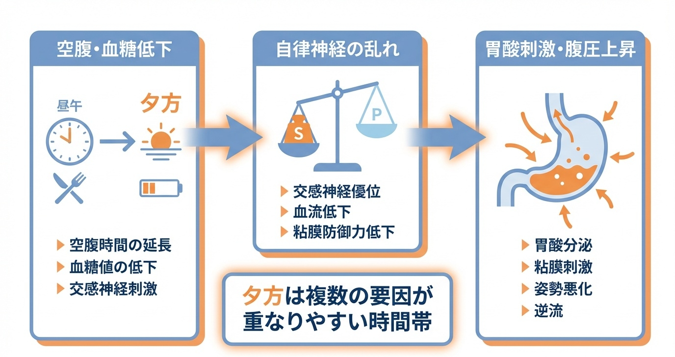 夕方になると胃が痛い背景には空腹や疲労、自律神経や胃酸の変動も重なります。