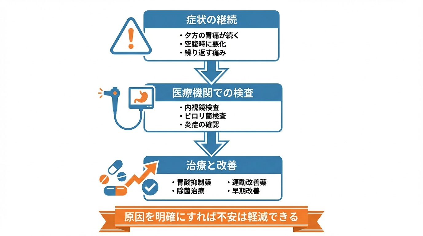 夕方になると胃が痛いのが当たり前になっていて、今は我慢できていたとしても、重大な疾患が隠れていないとも限らないので、放置するのは得策ではありません。